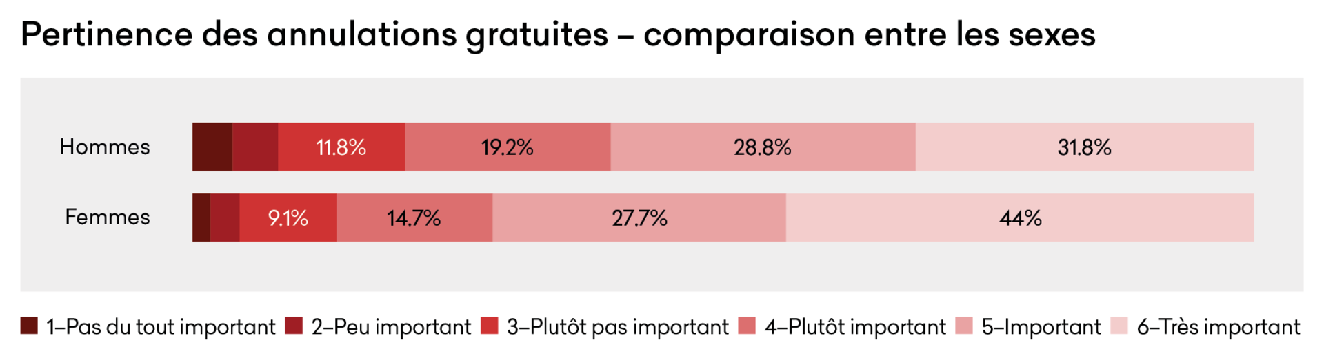 Il est également intéressant de constater que les possibilités d'annulation gratuite sont nettement plus importantes pour les femmes que pour les hommes : alors que 43,8 % des femmes interrogées considèrent cet aspect comme primordial, seuls 31,9 % des hommes sont de cet avis.