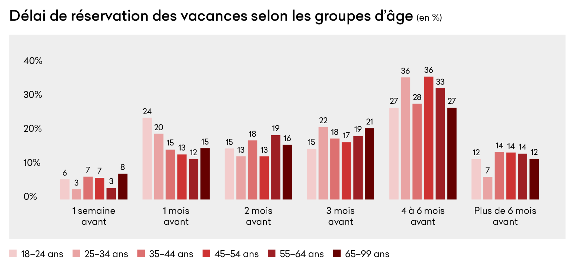 Les différences entre les groupes d'âge sont toutefois marquées : 24 % des 18-24 ans réservent un mois à l'avance. Chez les 25-34 ans, c'est l'anticipation de trois mois qui domine, tandis que 36 % des 25-34 ans et 36 % des 45-54 ans planifient leurs vacances quatre à six mois à l'avance.