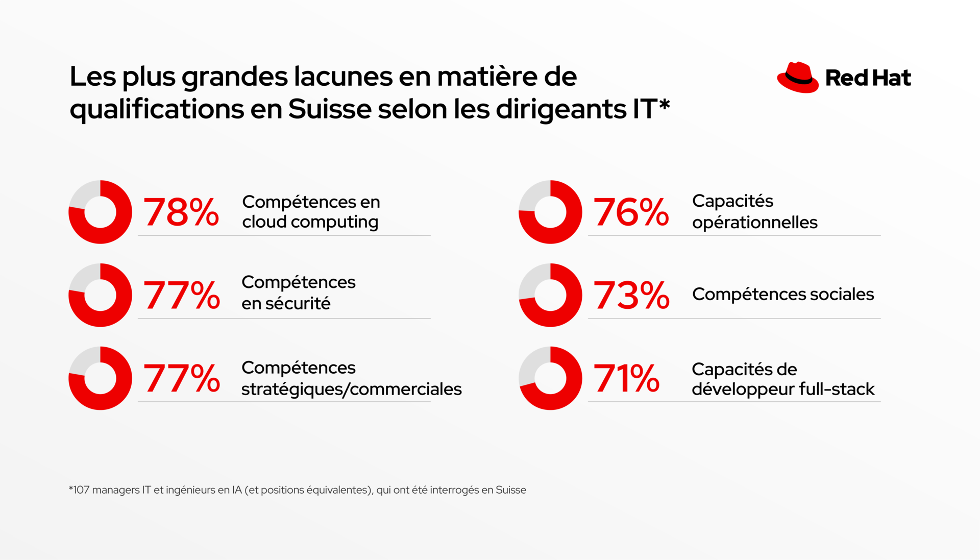 Le recrutement et la fidélisation des talents restent un défi. En Suisse, les personnes interrogées identifient trois lacunes critiques en matière de compétences au sommet de la liste : les compétences en cloud computing (78 %) arrivent en premier, tandis que les compétences en sécurité (77 %) et les compétences stratégiques/commerciales (77 %) sont citées presque à parts égales comme les besoins les plus urgents.